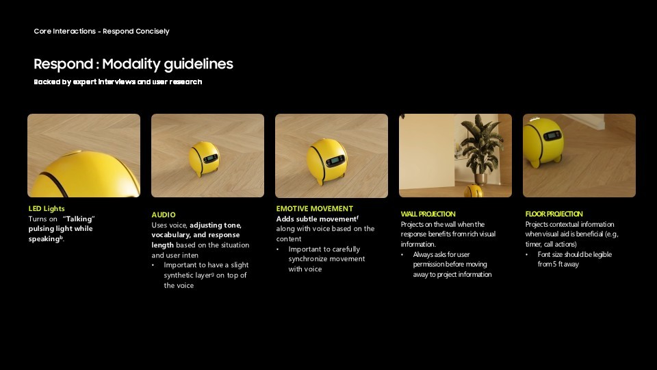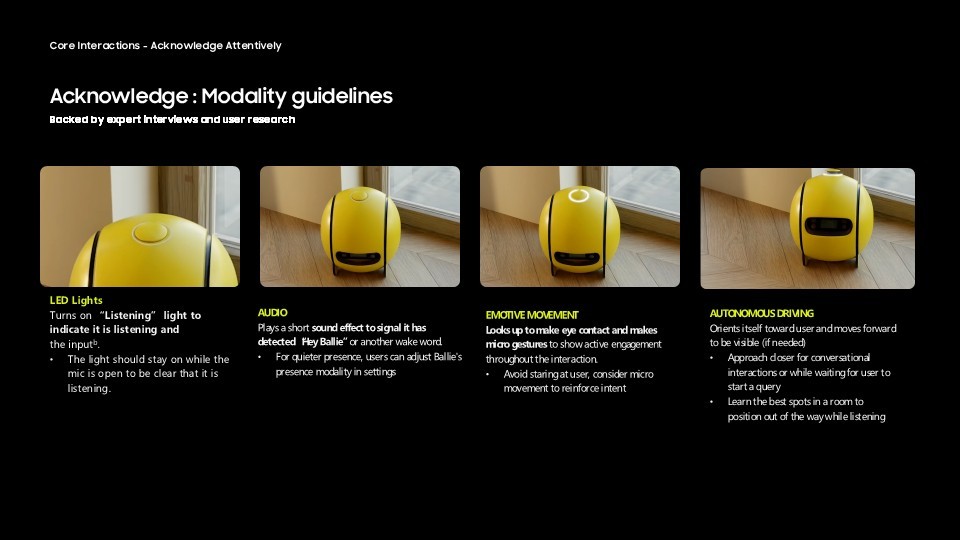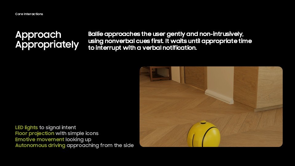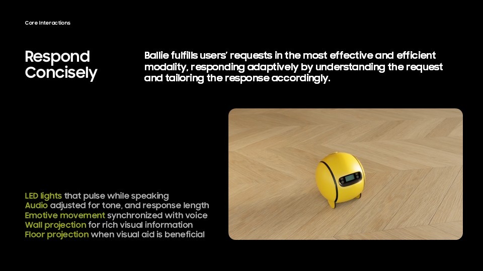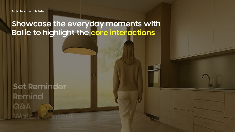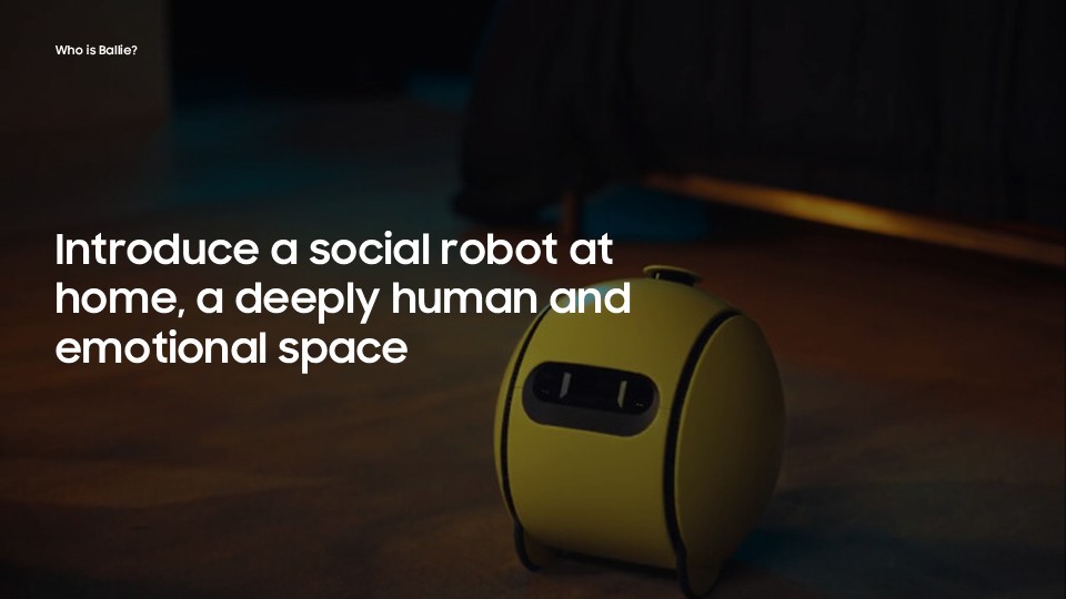 본 프로젝트는 삼성전자의 지능형 홈 로봇 '볼리(Ballie)'의 미래형 홈 엔터테인먼트 경험을 정의하고, 사용자 일상의 흐름에 최적화된 서비스 시나리오와 인터랙션 컨셉을 도출하는 데 주력했습니다. 단순히 기기의 기능을 나열하는 것이 아니라, 사용자의 수면, 업무, 휴식 등 하루의 라이프사이클을 심층적으로 분석하여 볼리가 '똑똑한 동반자(Smart Companion)'로서 어떤 가치를 전달할 수 있을지 탐구했습니다. 레이더, 카메라, IoT 센서 데이터 등을 유기적으로 결합하여, 기술이 사용자에게 직접적인 명령이 아닌 '자연스러운 배려'로 체감될 수 있는 경험적 토대를 마련했습니다.