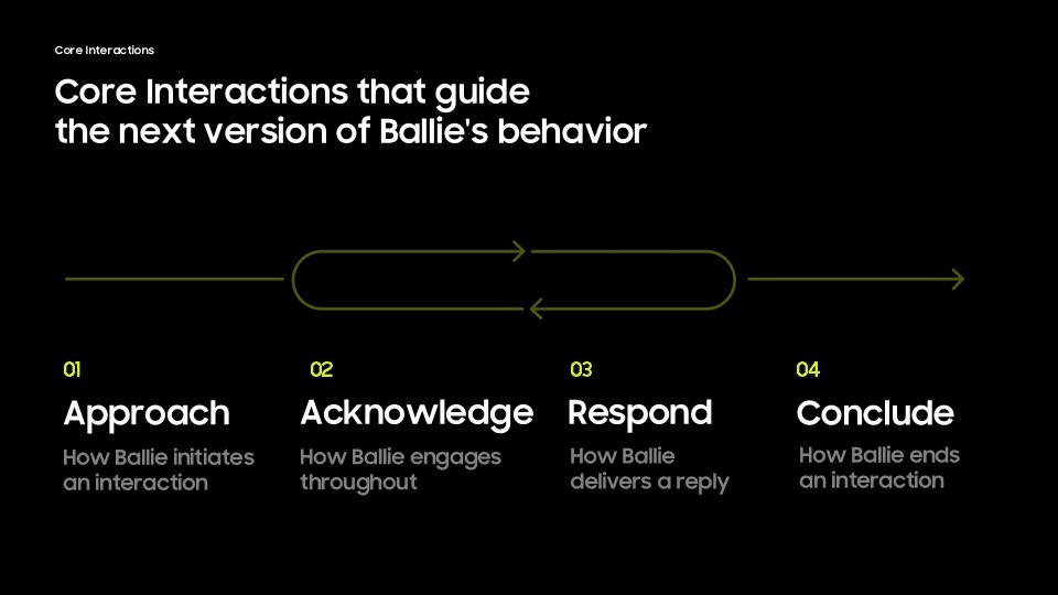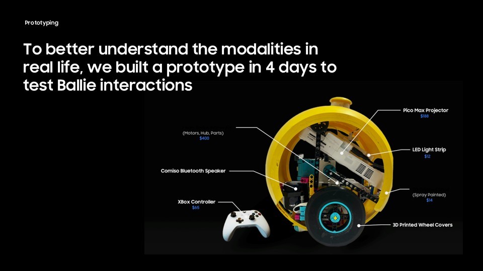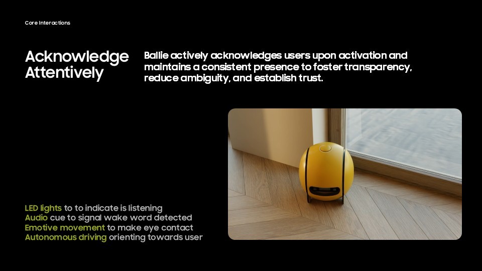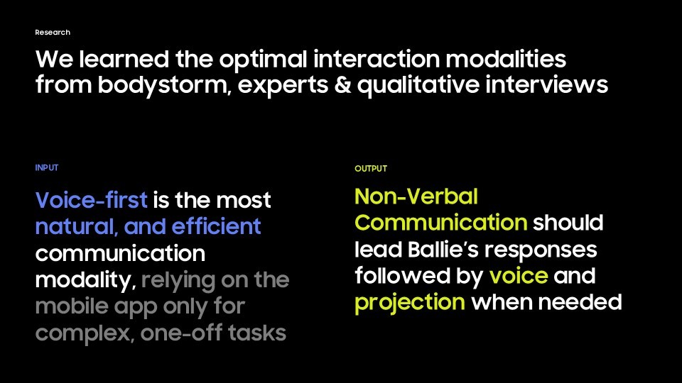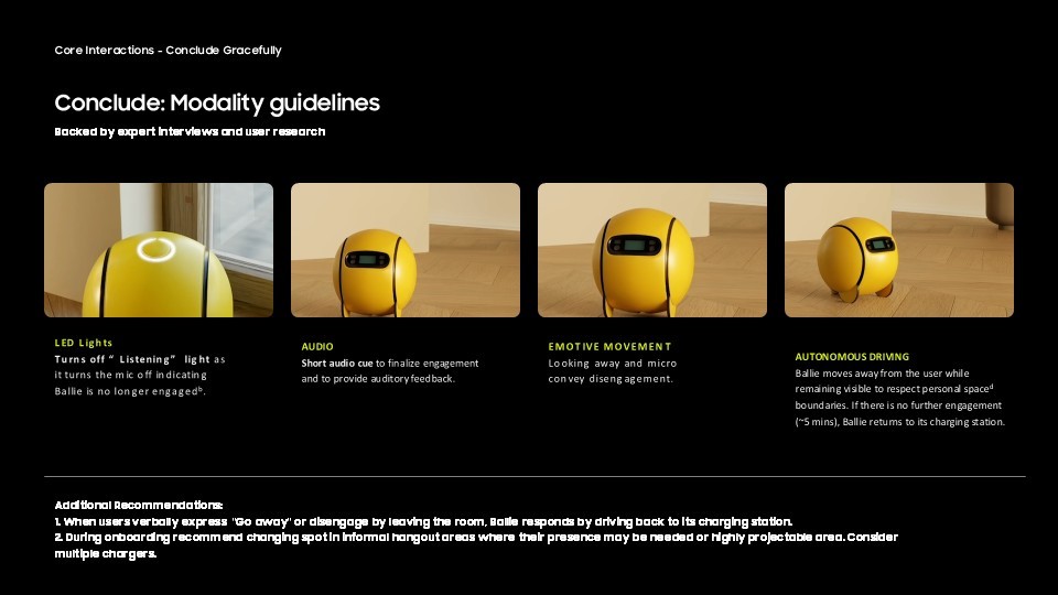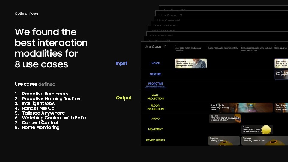 본 프로젝트는 삼성전자의 지능형 홈 로봇 '볼리(Ballie)'의 미래형 홈 엔터테인먼트 경험을 정의하고, 사용자 일상의 흐름에 최적화된 서비스 시나리오와 인터랙션 컨셉을 도출하는 데 주력했습니다. 단순히 기기의 기능을 나열하는 것이 아니라, 사용자의 수면, 업무, 휴식 등 하루의 라이프사이클을 심층적으로 분석하여 볼리가 '똑똑한 동반자(Smart Companion)'로서 어떤 가치를 전달할 수 있을지 탐구했습니다. 레이더, 카메라, IoT 센서 데이터 등을 유기적으로 결합하여, 기술이 사용자에게 직접적인 명령이 아닌 '자연스러운 배려'로 체감될 수 있는 경험적 토대를 마련했습니다.