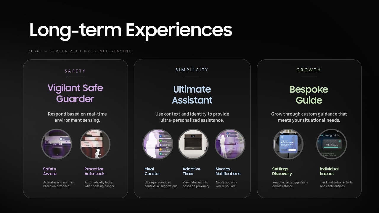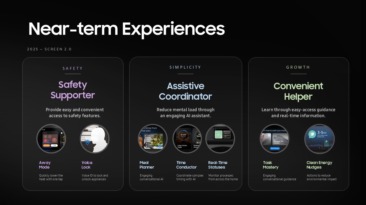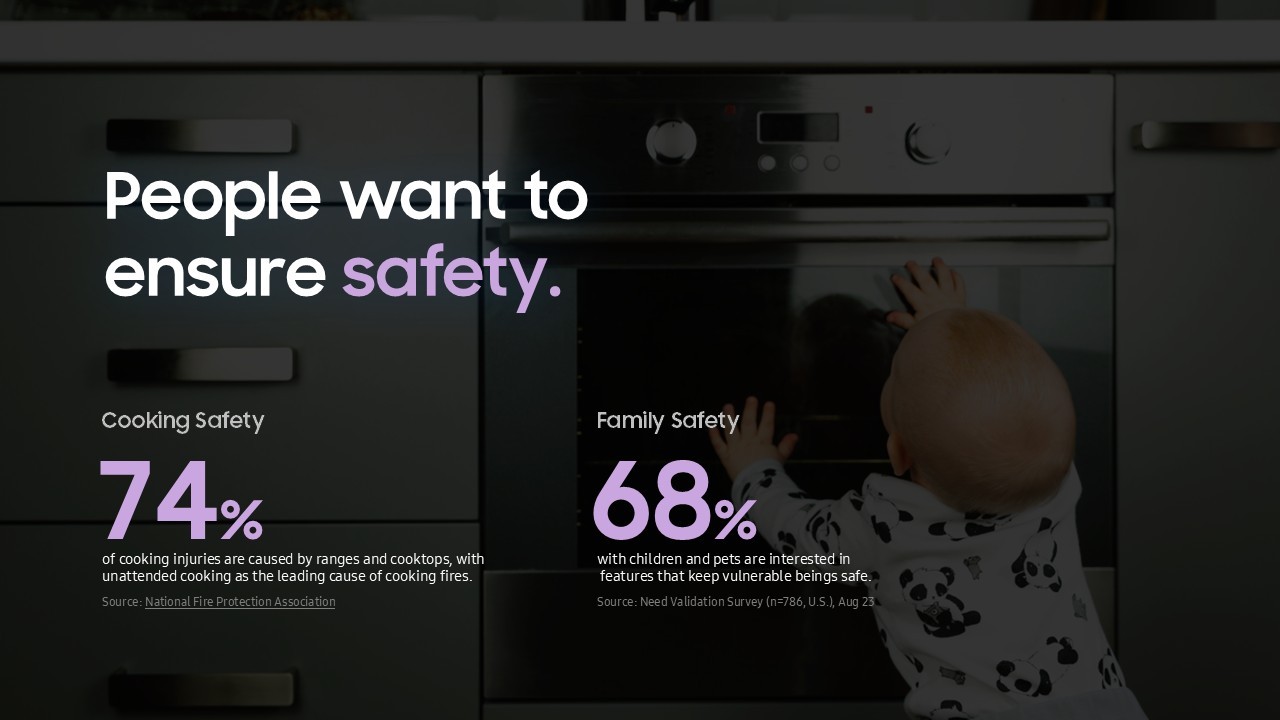 본 프로젝트는 가전 기기에 탑재된 7인치 스크린의 가치를 재정의하고, 삼성전자의 'Calm & Human' 스마트 홈 비전을 실천하기 위한 서비스 컨셉을 도출하는 데 주력했습니다. 기술 중심의 접근에서 벗어나 사용자가 일상에서 느끼는 실질적인 가치를 정의하고, 이를 통해 가전이 어떻게 지능형 파트너로 진화할 수 있는지 그 전략적 방향성을 제안했습니다. 안전(Safety), 단순함(Simplicity), 성장(Growth)이라는 세 가지 핵심 필러를 중심으로, 단순한 기기 제어를 넘어선 차세대 가전 경험의 청사진을 수립하는 역할을 수행했습니다.
