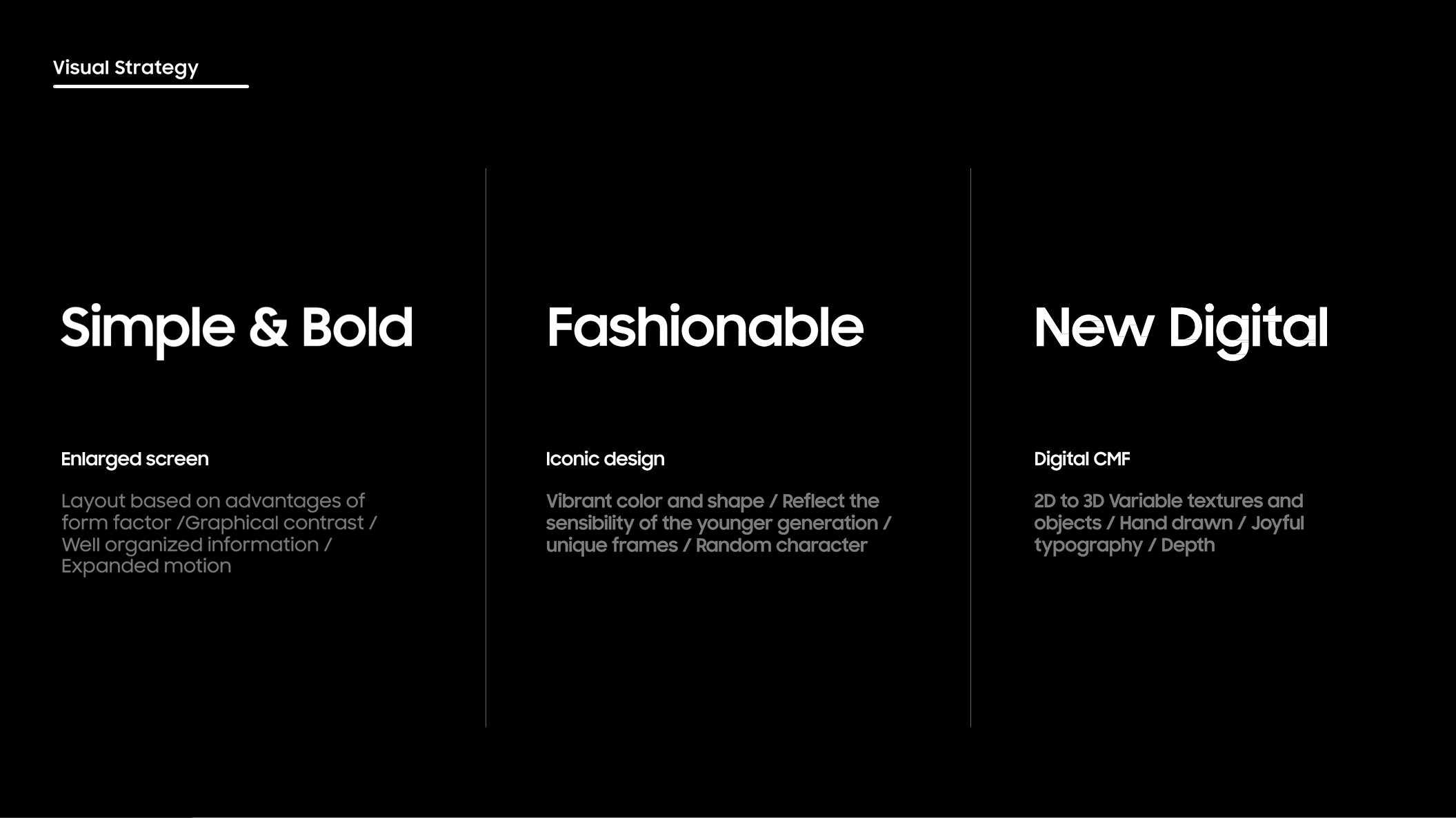 헬스 데이터를 직관적으로 시각화한 'Depth Steps'와 'Sleep Story'를 통해 건강 관리를 개인화된 여정으로 승화시켰습니다. 특히 AI 생성 팔레트를 활용한 'Your Hues'와 개인의 이니셜을 새기는 'Signature Monogram' 등의 기능을 통해 기기의 소유 가치를 극대화했습니다. 이러한 결과물들은 얇은 베젤이라는 하드웨어적 강점을 디지털 공간의 확장성으로 치환하고, 기능성과 심미성 사이의 완벽한 해답을 제시하는 성과를 거두었습니다.