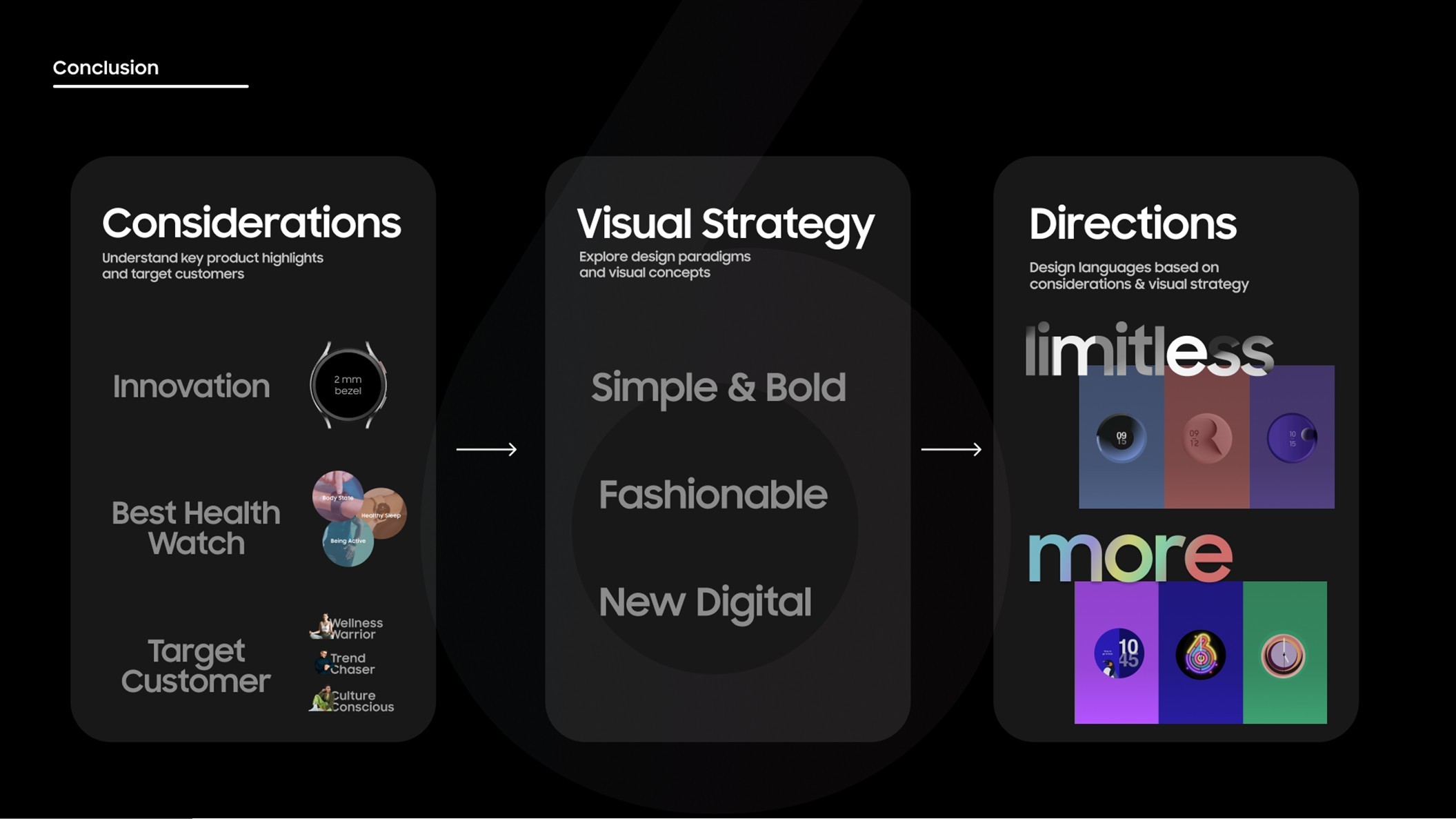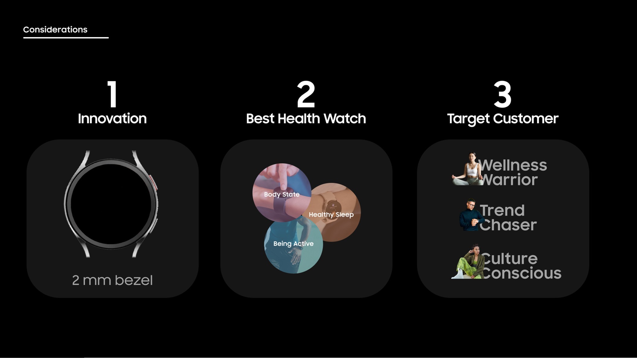 본 프로젝트는 삼성 갤럭시 워치 6 및 워치 6 클래식의 핵심 변화인 2mm 슬림 베젤을 기념하고, 이를 '베스트 헬스 워치'로서의 정체성으로 연결하기 위해 진행된 컨셉 제안입니다. 웰니스 워리어(Wellness Warrior), 트렌드 체이서(Trend Chaser) 등 타겟 고객군에 대한 심층적인 분석을 바탕으로, 혁신적인 기술력을 디자인적 언어로 전환하는 데 집중했습니다. 이를 통해 단순한 정보 전달을 넘어 기술이 사용자의 감성과 일상에 자연스럽게 스며드는 시그니처 워치 페이스 솔루션을 도출하고자 했습니다.