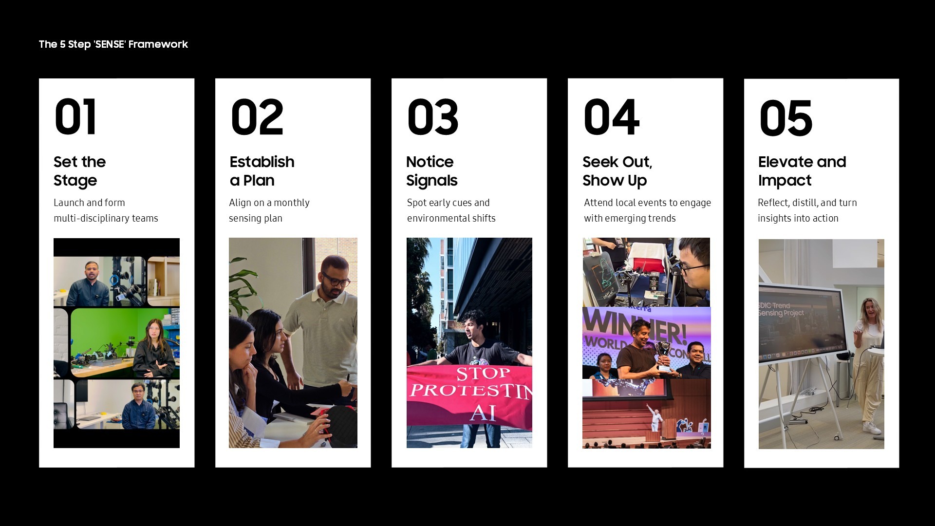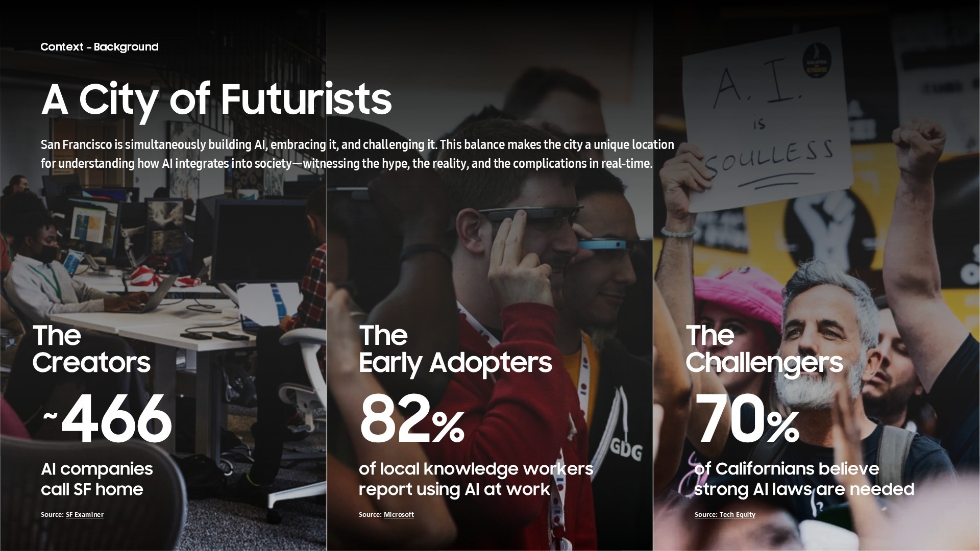본 프로젝트는 글로벌 트렌드의 발원지인 샌프란시스코의 현지 시그널을 분석하여, 삼성 MX의 중장기 전략을 위한 인사이트를 도출하는 연구로 진행되었습니다. 거리의 빌보드 광고부터 현지 전문가의 목소리까지, 파편화된 로컬 데이터를 체계적으로 수집하고 이를 글로벌 시장에 적용 가능한 전략적 프레임워크로 변환하는 데 집중했습니다. 기술과 사회의 교차점에서 발생하는 미세한 변화를 포착하여 미래 경험의 방향성을 제시하는 시각화 작업을 주도했습니다.